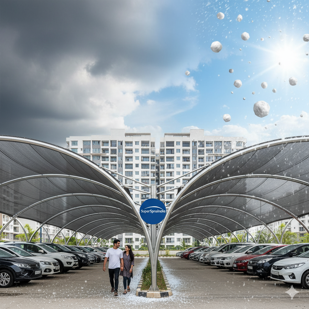 One of the most reliable tensile canopy structure providers in India is SuperSpnaIndia. They offer long-lasting and well-thought-out hail protection systems that help keep cars safe in any weather.